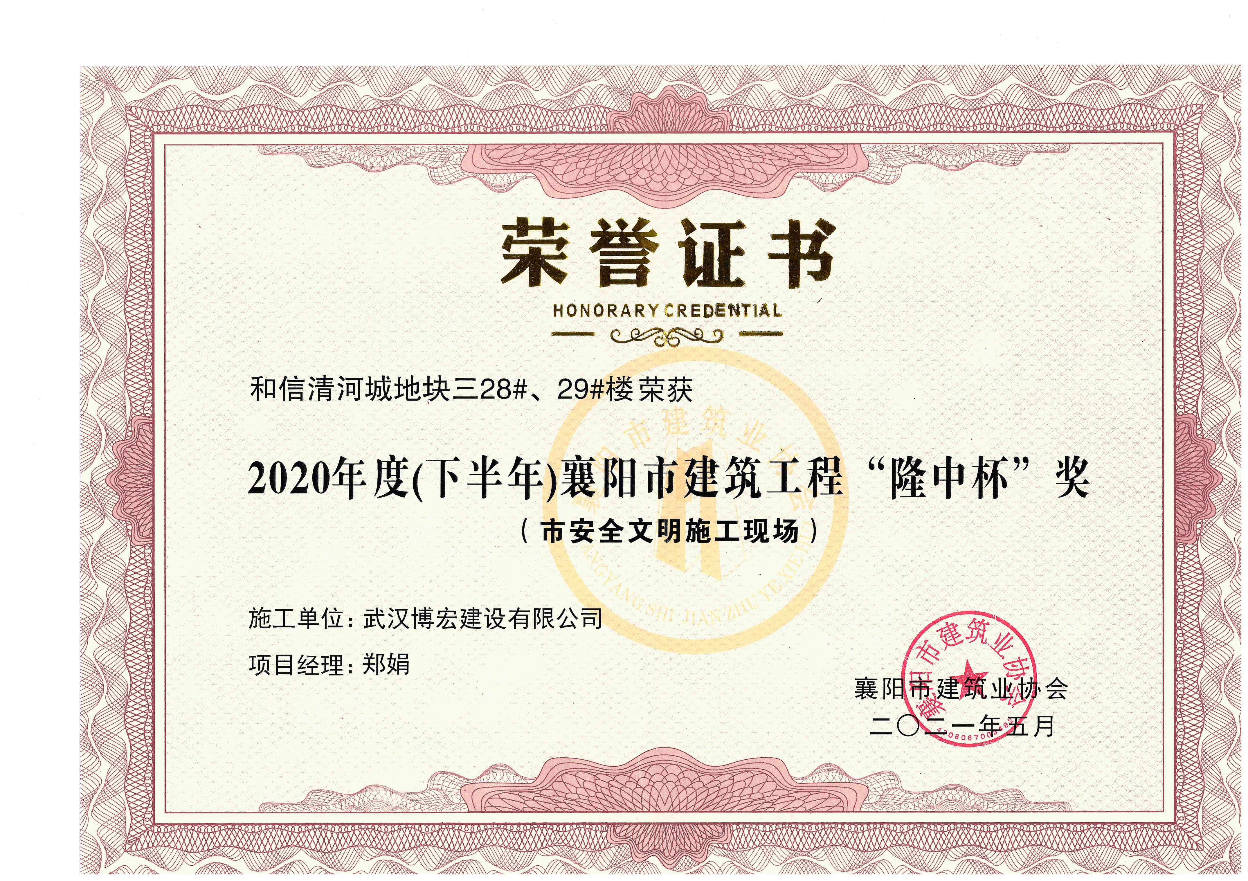 和信清河城地塊三28#、29#樓2020年度(下半年)襄陽市建筑工程“隆中杯”獎(市安全文明施工現(xiàn)場