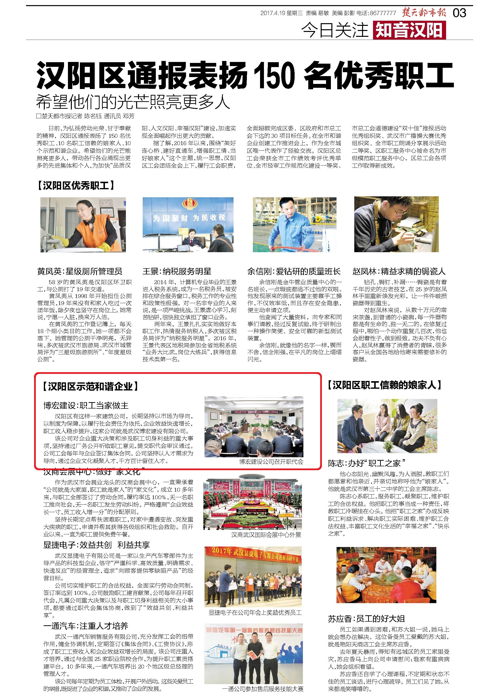 2017年4月19日,楚天都市報知音漢陽板塊報道了漢陽區(qū)示范和諧企業(yè)獲獎情況,其中我公司博宏建設(shè)名列首位。