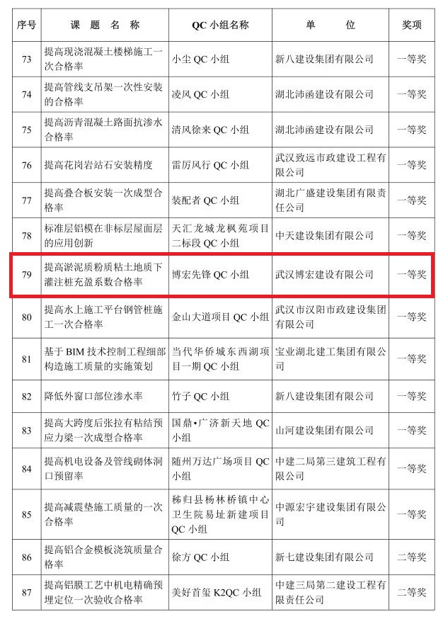 每年,公司都根據(jù)各大在建項(xiàng)目的實(shí)際情況,針對生產(chǎn)中的難題,從挖潛增效、強(qiáng)化管理等角度確定課題,成立相關(guān)技術(shù)攻關(guān)小組,構(gòu)思切實(shí)可行的質(zhì)量提升措施,并邀請技術(shù)專家對其進(jìn)行指導(dǎo)完善。本次獲得一等獎(jiǎng)的《提高淤泥質(zhì)粉質(zhì)粘土地質(zhì)下灌注樁充盈系數(shù)合格率》,在其攻關(guān)過程中,“博宏先鋒 QC 小組”制定了嚴(yán)格的工作計(jì)劃和科學(xué)的攻關(guān)流程,按月推進(jìn),最終形成了一套可復(fù)制、可推廣的工作經(jīng)驗(yàn),攻關(guān)小組也通過QC活動掌握了一套提升項(xiàng)目管理質(zhì)量的方法論。
