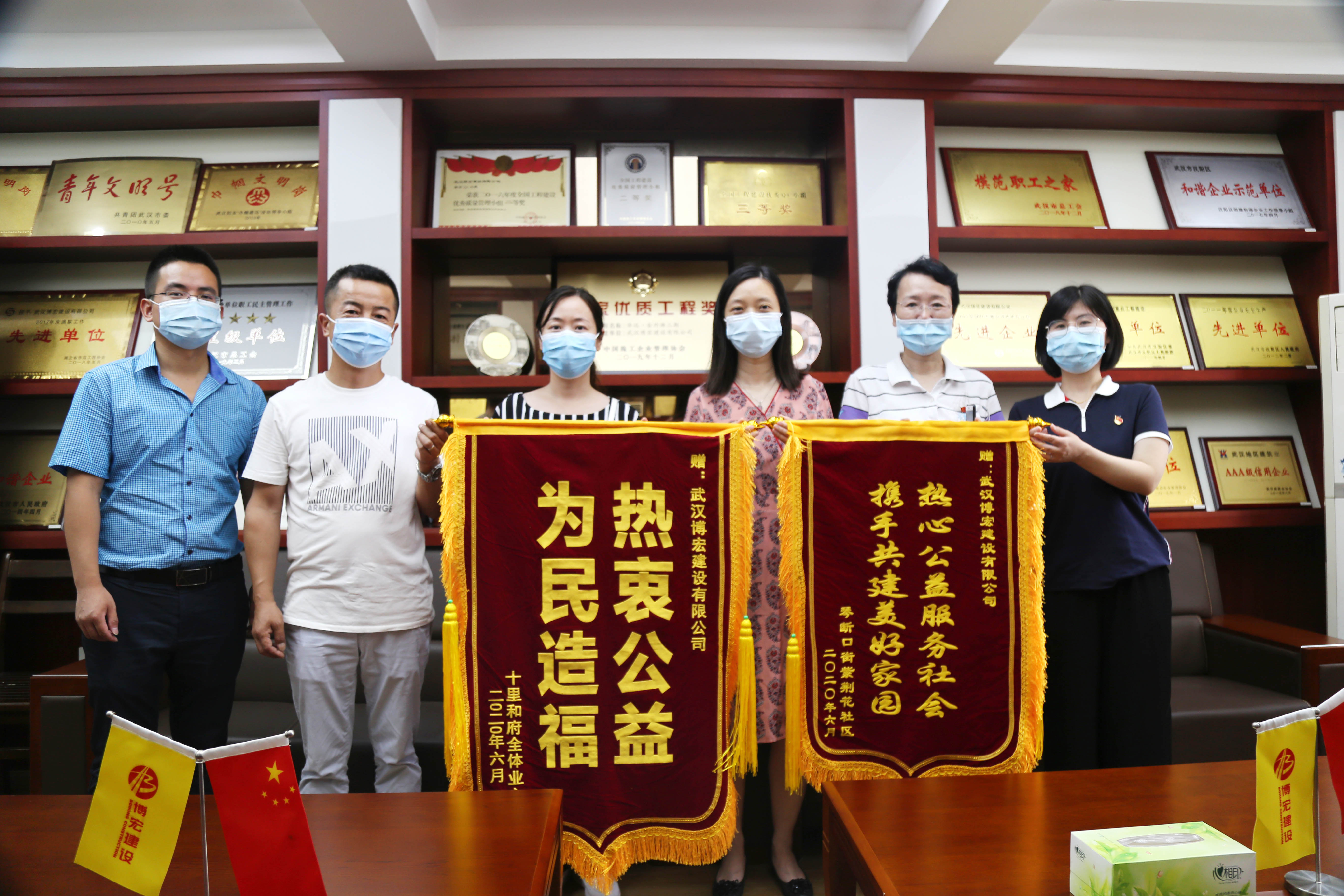 ?? 69日上午,漢陽區(qū)委宣傳部代表和漢陽區(qū)紫荊花社區(qū)、十里和府小區(qū)物業(yè)代表結(jié)伴而來,為博宏建設(shè)送來兩面錦旗,感謝博宏建設(shè)在改善社區(qū)工作環(huán)境,服務(wù)社區(qū)公益事業(yè)中做出的努力。據(jù)悉,十里和府小區(qū)一號樓一樓裝修老舊,地面不平,居民出行不便,博宏建設(shè)裝飾裝修項(xiàng)目部在周邊施工時(shí),接到相關(guān)指示,先后派出6人歷時(shí)6天,一并對該區(qū)域近300平米進(jìn)行了地磚更換,裝修效果得到了居民和社區(qū)的高度認(rèn)可。