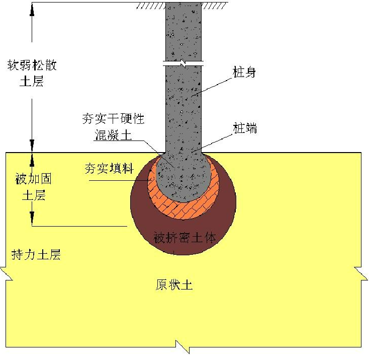 “載體樁”由上部樁身和下部“復合載體”兩部分組成。樁身一般為現(xiàn)澆鋼筋混凝土結(jié)構,“復合載體”是位于樁端底部、經(jīng)深層填料夯實的復合體。