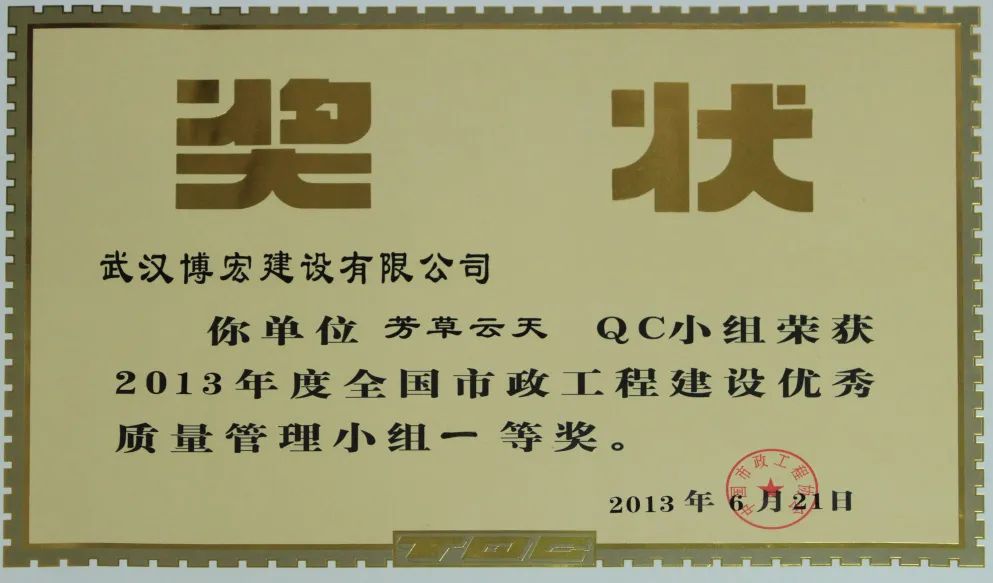 芳草云天QC小組成立于2011年5月31日,本小組從企業(yè)經(jīng)營戰(zhàn)略、方針目標(biāo)和現(xiàn)場存在的問題出發(fā),以提高效能、降低消耗、實現(xiàn)經(jīng)濟與社會效益雙贏為目的,全面優(yōu)化項目質(zhì)量。歷年來追求卓越、探索新品,曾獲得2013 年全國市政工程建設(shè)協(xié)會優(yōu)秀QC成果一等獎、2014年湖北省市政工程建設(shè)優(yōu)秀QC成果二等獎、2015年湖北省市政工程建設(shè)優(yōu)秀 QC成果一等獎、2022年度中國施工企業(yè)管理協(xié)會工程建設(shè)質(zhì)量管理小組活動成果二等獎、2022年中國建筑業(yè)工程建設(shè)質(zhì)量管理小組活動成果三等獎等榮譽。
